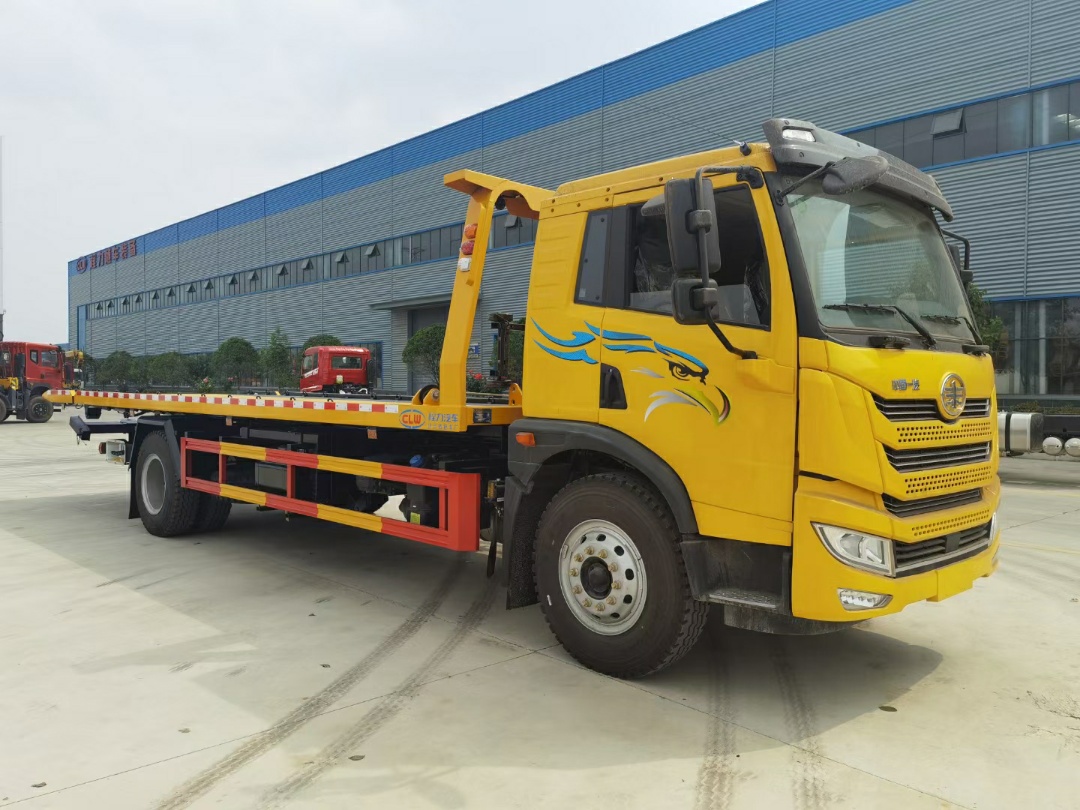 上裝配置:10噸上裝,6mm花紋板,三角鐵加滿,10個厚滑道,加厚雙副梁,寬2.55米,尾部翻轉1.2米,10噸主梁安裝3節托臂,10噸卷揚,L型抱胎架1對,輪胎擋板2個,2個小輪,綁帶4條,拖叉一套,嚴格按公告生產。